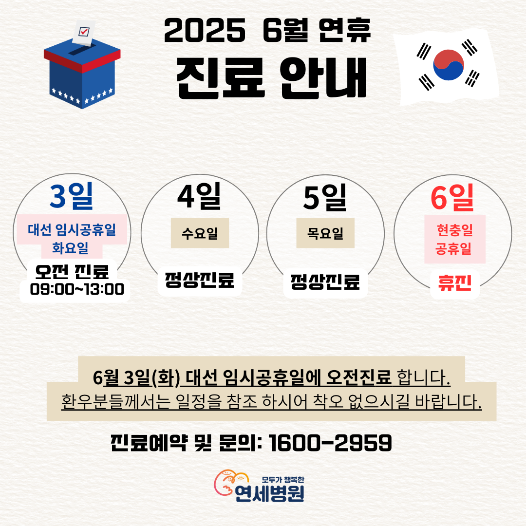 | Á¦¸ñ | 6¿ù ¿¬ÈÞ Áø·á ¾È³» |